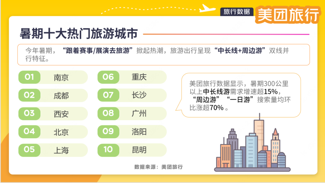 苏超赛事的火热,助推南京进入暑期十大热门旅游城市榜首——作为全年出游高峰,2025年暑期旅游正式收官。美团旅行刚刚发布的《2025年暑期文旅消费观察》显示,今年暑期旅游出行呈现“中长线+周边游”双线并行特征。美团旅行数据显示,暑期300公里以上中长线游需求增速超15%,“周边游”“一日游”搜索量均环比涨超70%。旅游度假品质化、个性化趋势凸显,“小团游”从小众迈向主流,“住宿+餐饮”“住宿+体验”等跨界间夜需求激增,住宿业供需匹配迎来新思路。